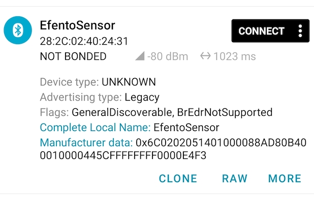 A simple way to view the advertising data is by using Nordic Semiconductor’s nRF Connect mobile application for Android or iOS, which displays advertising information from all nearby BLE devices, including the “Manufacturer data” field used by Efento loggers.